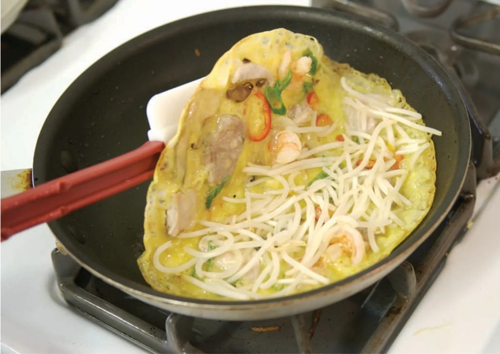 The Vietnamese dish Bánh xèo, featured in Robert Danhi’s Southeast Asian Flavors, is a crispy pancake cooked to order, made with a rice flour crepe batter, topped with fresh vegetables and dipped in sweet-and-sour sauce (for an at home version, a squeeze of lime will do the trick). Coconut milk in the batter lends a mild sweetness that will appeal to young palates and turmeric gives a bright yellow glow that practically begs to be eaten. Fun fact: bánh xèo, means "sizzling cake" and is an onomatopoeia for the sound of the batter sizzling as it is poured into a hot pan.